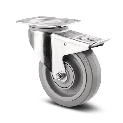 The Tente Alpha castor is suited for heavy duty applications within various hospital environments. MSP currently offers the Alpha 3477 series in a diameter of Ø100mm, Ø125mm, Ø160mm and Ø200mm in the UFP Elastech wheel tread and with plate fitting. This is a total lock castor and locks both the wheel and swivel head.