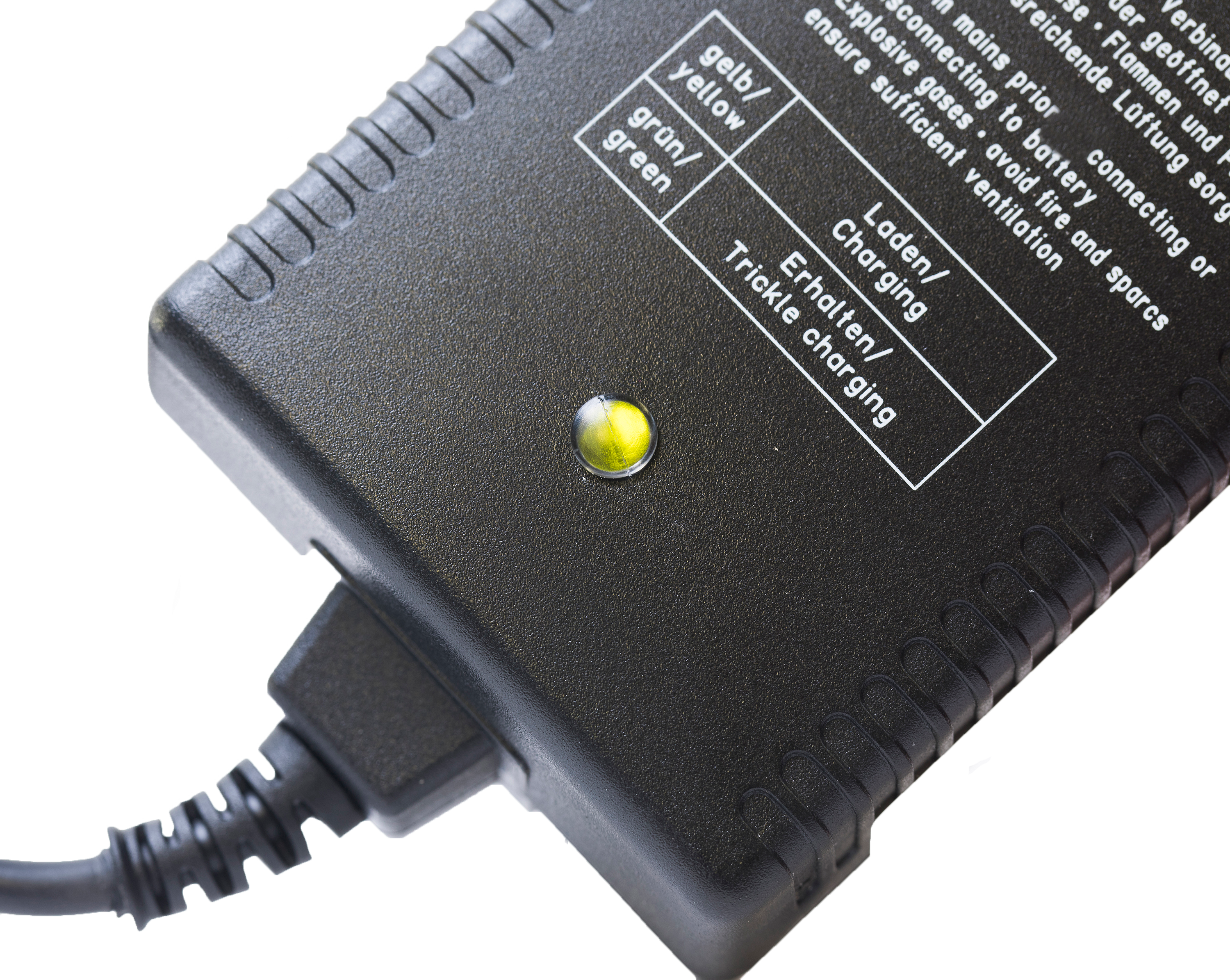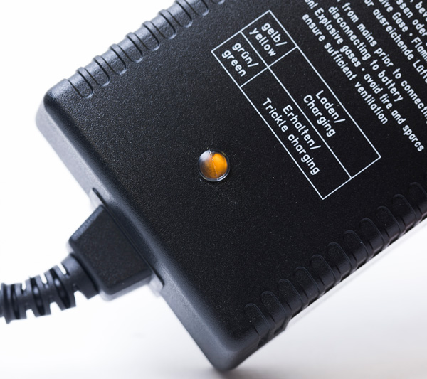 Das Ladegerät selbst besteht aus starkem ABS-Kunststoff und verfügt über eine LED-Anzeige, die anzeigt, wann das Akkupack vollständig geladen ist. Sobald der Akku vollständig geladen ist, funktioniert es als Erhaltungsladegerät.