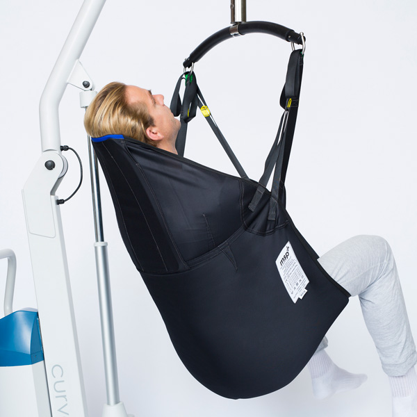 MSP presents a top of the line high quality standard sling, designed for (short) dry transfers.This sling is equipped with loops which can be hung up on three different heights. This provides more flexibility in how to transfer the client, in a more upright position or a more tilted position. The attachment points of the loops are colour coded for visual confirmation. It can be used on all 2- and 4-point spreader bars with hooks.