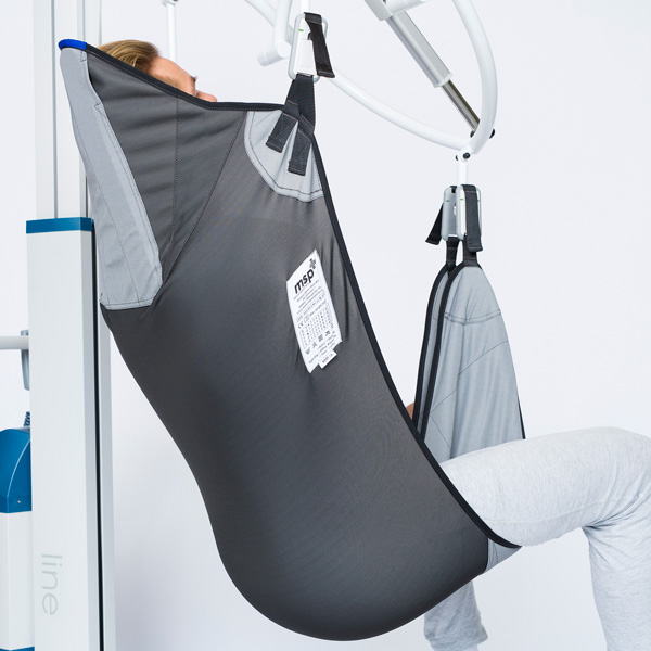 MSP presents it's highest quality Seamless sling, designed for dry transfers and which can be left around the client for the entire day.This sling is equipped with the patented visual safety clip. This clip has two indicators on the front and back, which are red when the clip is not or wrongly attached and turn green when the clip is correctly attached to the spreader bar.